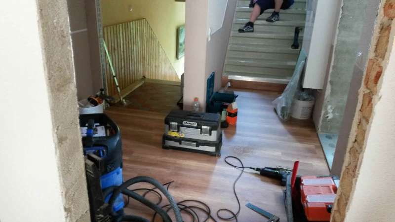 Zuerst wurde das Treppenpodest, welches sich unmittelbar an der Wohnungstür befindet, verlegt. Als Laminat kam das Dekor Eiche Vintage zum Einsatz. Mit der Stichsäge wurden die kleineren Schnitte gleich unmittelbar am Ort des Geschehens ausgeführt. Dies vermeidet lange Wege und spart Montagezeit. Auch hierbei kommt wieder eine Sägestaub-Absaugung zum Einsatz.