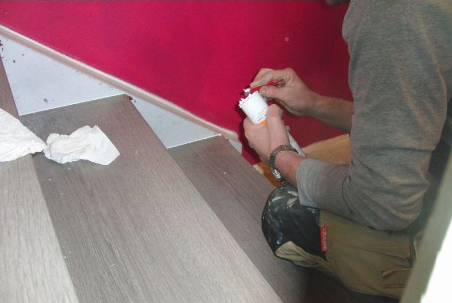 Damit sich die renovierte Treppe nahtlos in das Gesamtbild fügt und der Maler möglichst leicht lackieren kann, wird der Übergang zwischen Treppenstufen und Treppenwangen zudem mit überstreichbarem Acryl versiegelt.