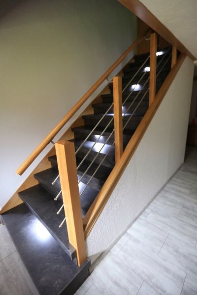 Während in diesem Treppenhaus die Treppenwangen, Pfosten und Handläufe des Geländers aus Eiche gefertigt wurden und hervorragend mit den Decken-Balken harmonieren, sind die waagerechten Traversen aus modernem Edelstahl der eigentliche Blickfang dieser Treppensanierung.