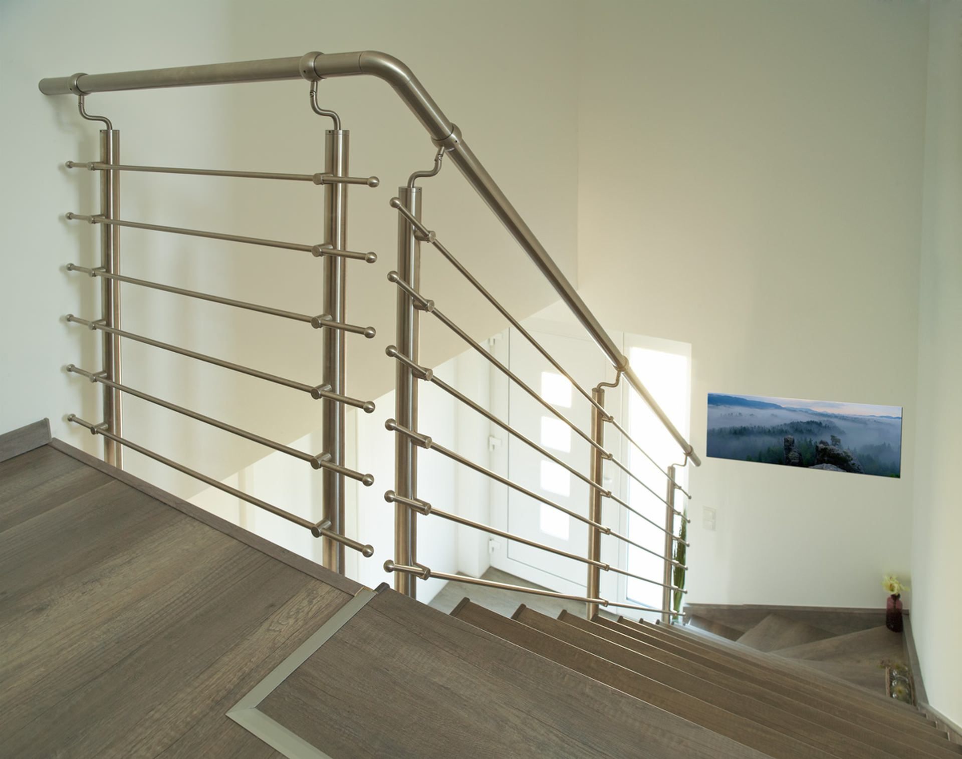 Die Setzstufen können auch in Edelstahl-Optik angeboten werden. Als Ergänzung zu einem Edelstahlgeländer.
